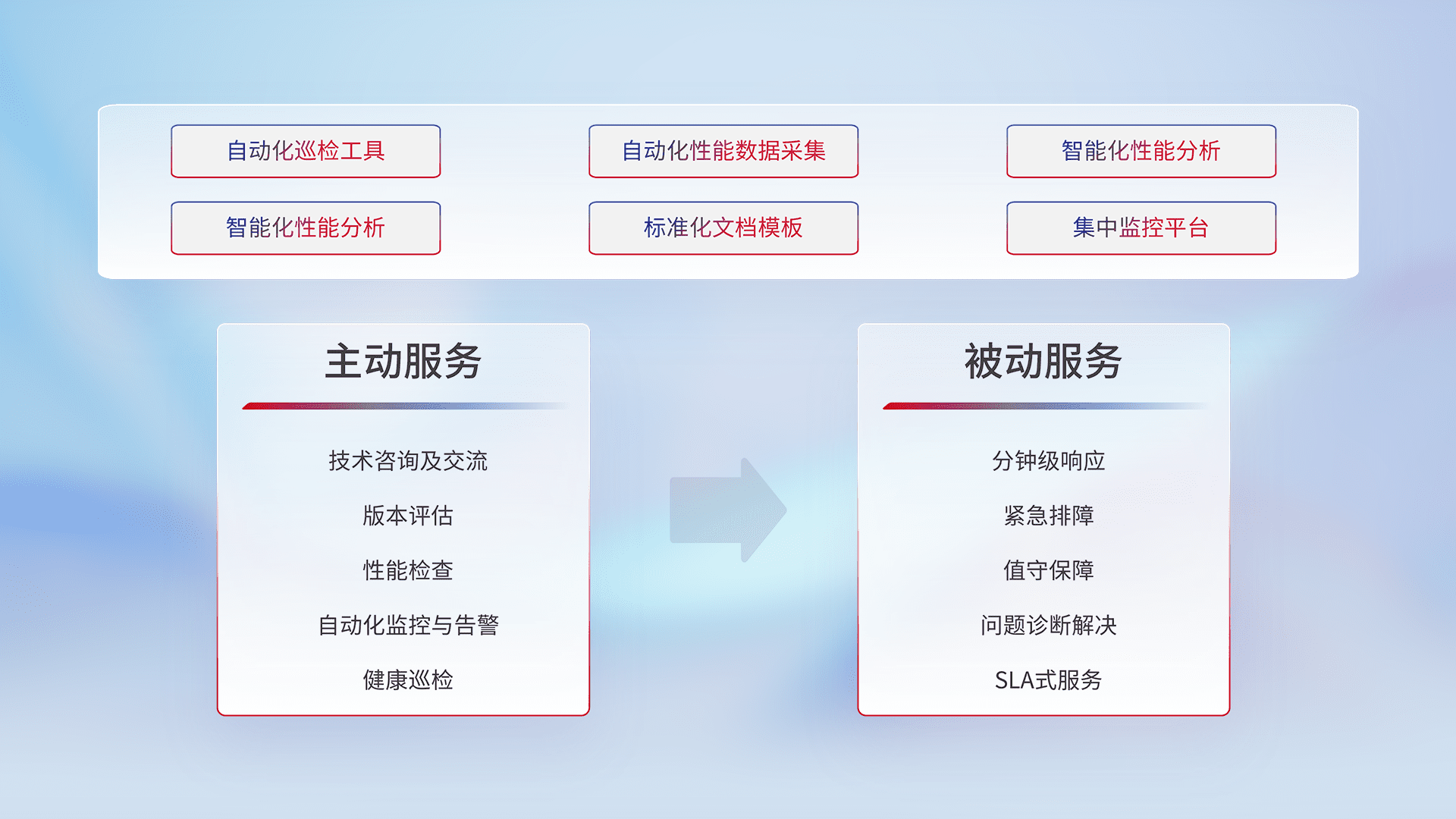 智能化工具和标准化文档,,,保障服务质量,,,提供主动服务(包含技术咨询、、、版本评估、、性能检查、、、、自动化监控与告警、、健康巡检)和被动服务包含(分钟级响应、、紧急排障、、值守保障、、、、问题诊断解决、、、、SLA服务)。。