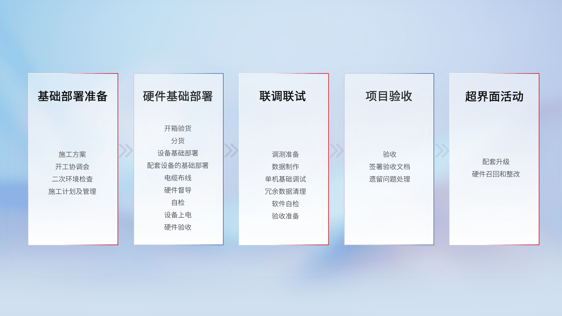 从基础部署准备、、、硬件基础部署、、联调联试、、、项目验收、、、越界面活动的全过程可追溯,,保证施工质量和进度。。。